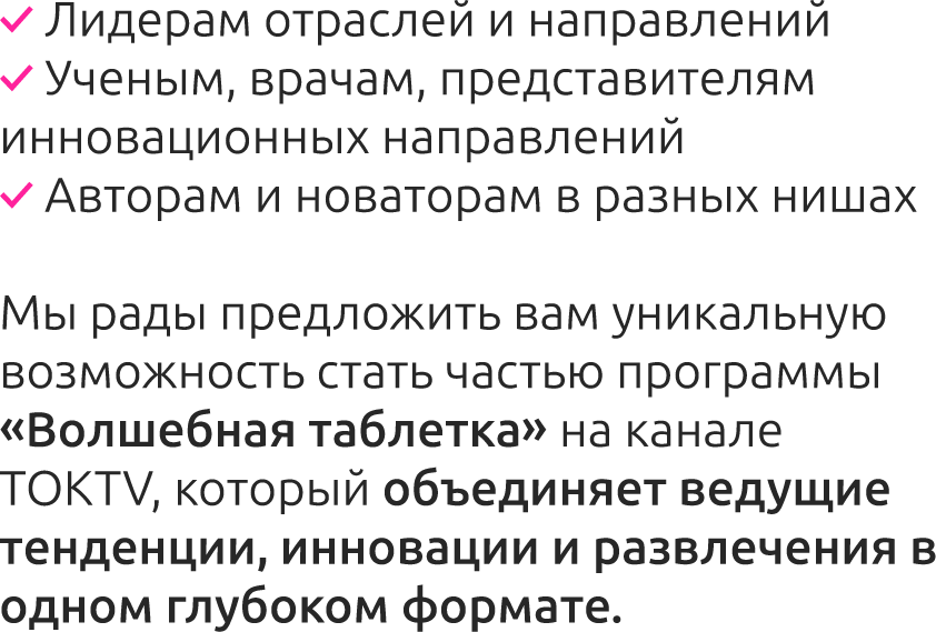 Присоединяйтесь к "Волшебной таблетке" и станьте частью ТВ, которое меняет жизни! Ваша инновация может стать решением, которое будет пользоваться спросом у миллионов.